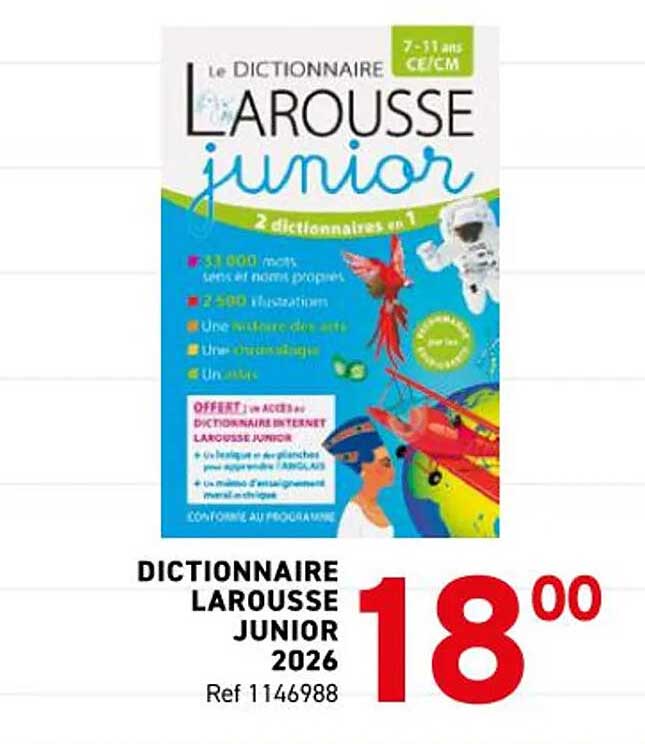 Découvrez dès maintenant la offre DICTIONNAIRE LAROUSSE JUNIOR 2026 dans le catalogue de Trafic. Cette offre est valable du 13/08/2025 au 18/08/2025.