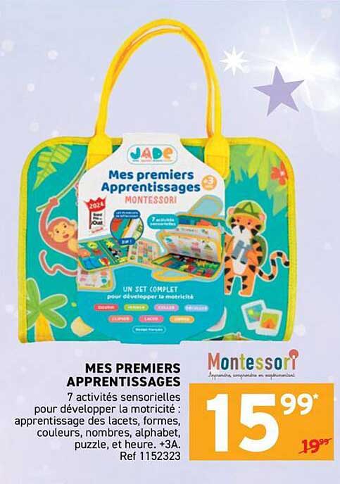 Découvrez le jeu "Mes premiers apprentissages" de Jade, un set Montessori complet conçu pour les tout-petits. Ce kit comprend sept activités sensorielles passionnantes qui aideront votre enfant à développer sa motricité tout en s’amusant. Idéal pour éveiller la curiosité des jeunes esprits, ce produit constitue une excellente opportunité d’apprentissage précoce.