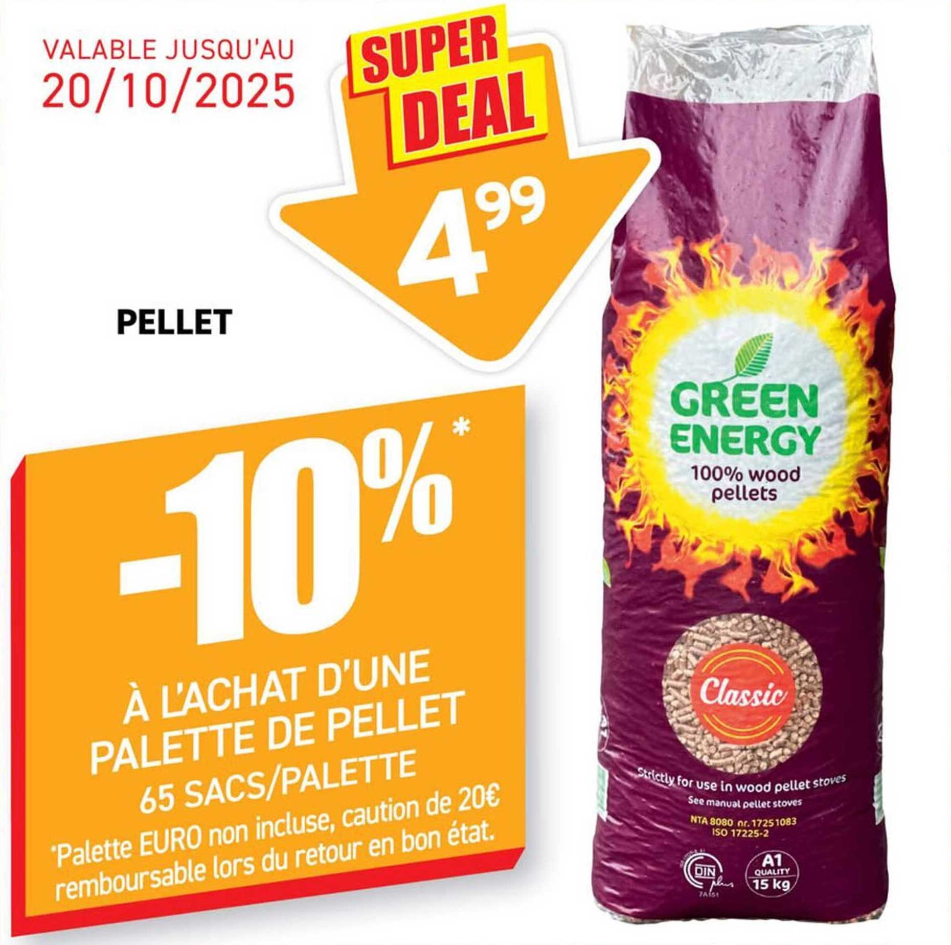 La saison froide approche et il est temps de penser à votre confort thermique. Découvrez notre offre exceptionnelle sur les pellets de bois Green Energy, disponibles à seulement 4,99 € ! Ce combustible est idéal pour les poêles à pellets, garantissant chaleur et économie. En plus d’un prix imbattable, bénéficiez de 10 % de réduction lors de l'achat d'une palette de 65 sacs.