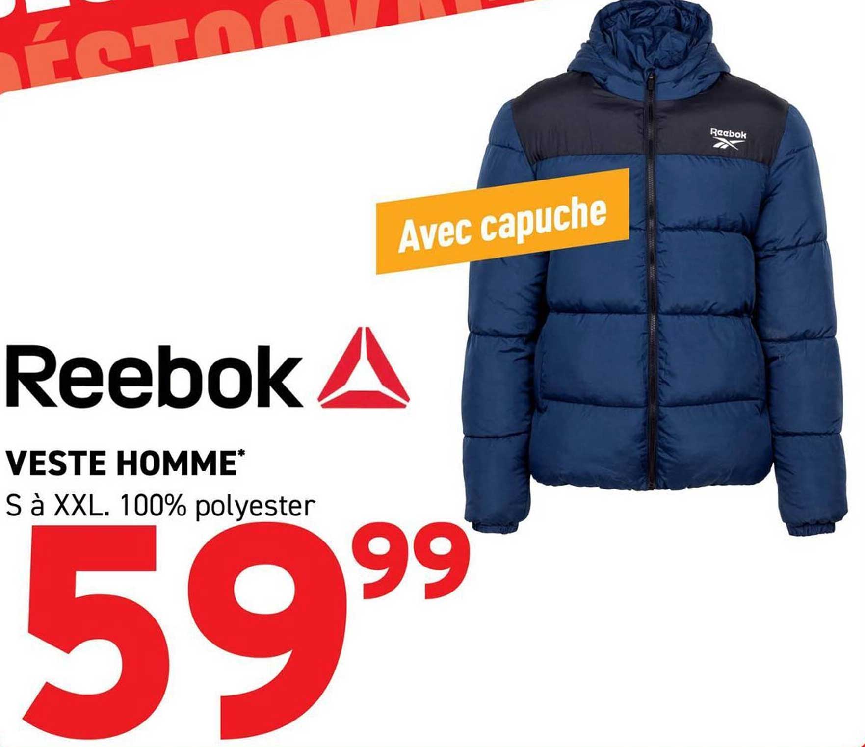 Profitez de l'incroyable promotion sur la veste homme Reebok, une pièce incontournable pour rester au chaud tout en ayant du style. Avec cette offre, vous avez une occasion parfaite de vous équiper pour les journées fraîches, tout en faisant des économies!