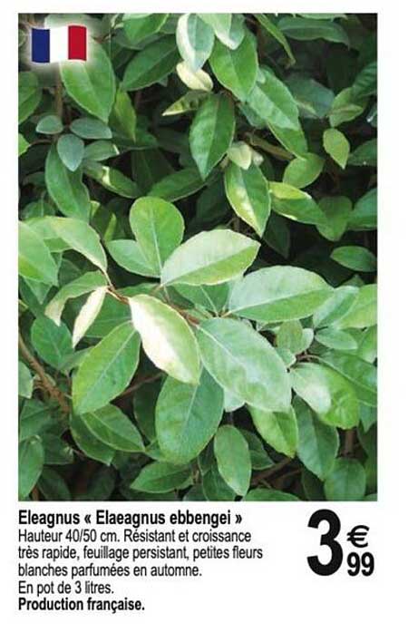 Découvrez l'Eleagnus “Elaeagnus ebbingei”, une plante incontournable pour embellir votre jardin ou votre balcon ! Avec une taille de 40/50 cm, elle est idéale pour ajouter de la verdure tout en restant compacte. Available à seulement 3,99 €, cette offre limitée est parfaite pour les amateurs de jardinage.