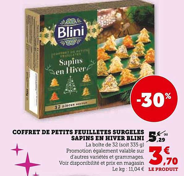 Découvrez dès maintenant la offre COFFRET DE PETITS FEUILLETES SURGELES SAPINS EN HIVER BLINI dans le catalogue de U Express. Cette offre est valable du 10/12/2024 au 24/12/2024.