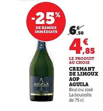 Ne manquez pas cette opportunité incroyable de déguster un Crémant de Limoux AOP Aguila, disponible en version brut ou rosé. Ce vin effervescent, raffiné et aromatique, est idéal pour célébrer vos moments spéciaux ou simplement pour se faire plaisir. Profitez d'une remise immédiate et ajoutez une touche festive à vos repas.