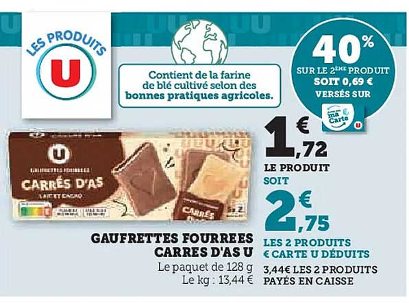 Découvrez dès maintenant la offre GAUFRETTES FOURREES CARRES D'AS U dans le catalogue de U Express. Cette offre est valable du 08/04/2025 au 21/04/2025.