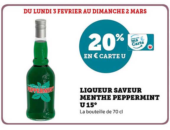 Découvrez dès maintenant la offre LIQUEUR SAVEUR MENTHE PEPPERMINT U 15° dans le catalogue de U Express. Cette offre est valable du 03/02/2025 au 02/03/2025.