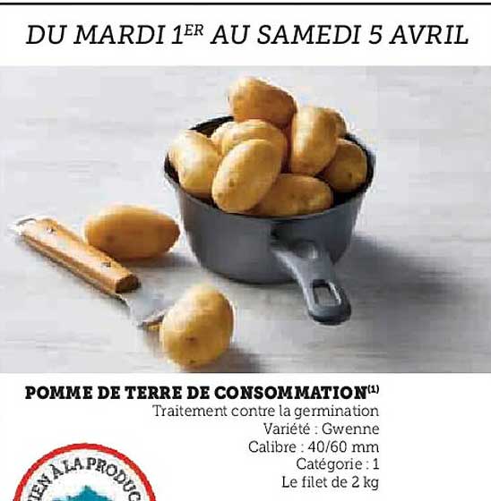 Découvrez notre promotion exceptionnelle sur les pommes de terre de consommation, disponibles du 1er au 5 avril. Ces pommes de terre de variété Gwenne sont parfaites pour vos plats quotidiens, alliant qualité et saveurs authentiques.