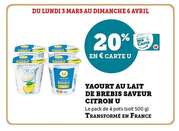 Découvrez l'offre de Yaourt Au Lait De Brebis Saveur Citron U chez U Express! Cette offre fantastique est maintenant disponible dans le nouveau catalogue de U Express. Profitez de cette occasion et économisez considérablement sur votre achat.